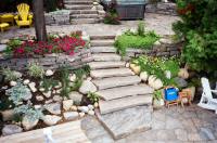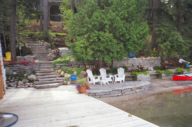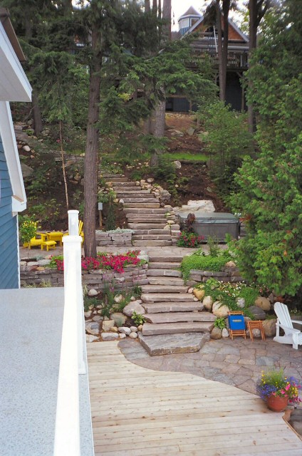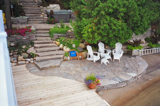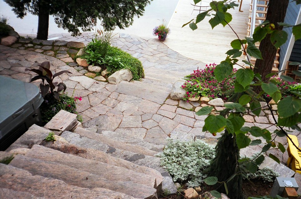 Natural stone landscaping in Parry Sound / Muskoka and the Georgian Bay Area. Quality flagstone hand carved and dry laid. Transform bush into trails down to waters edge with terraced patio's walkways and steps used to turn steep grade cottage lots into fine estates on Lake Muskoka, Joseph, Rosseau, and the Georgian Bay. All work guaranteed.