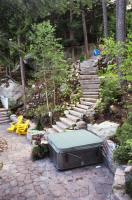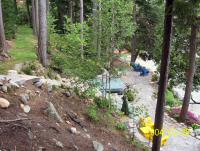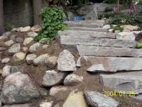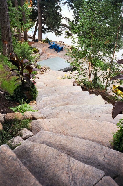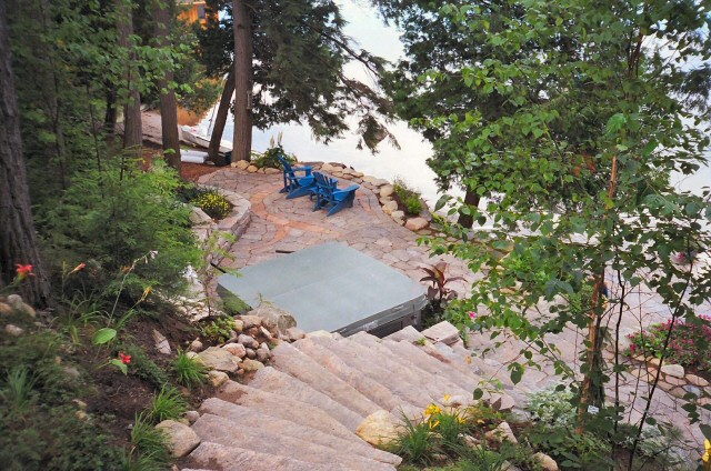 Natural stone landscaping in Parry Sound / Muskoka and the Georgian Bay Area. Quality flagstone hand carved and dry laid. Transform bush into trails down to waters edge with terraced patio's walkways and steps used to turn steep grade cottage lots into fine estates on Lake Muskoka, Joseph, Rosseau, and the Georgian Bay. All work guaranteed.