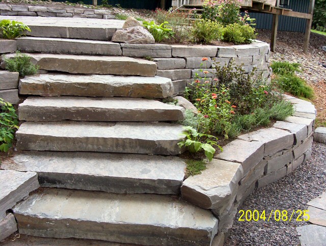 Natural stone landscaping in Parry Sound / Muskoka and the Georgian Bay Area. Quality flagstone hand carved and dry laid. Transform bush into trails down to waters edge with terraced patio's walkways and steps used to turn steep grade cottage lots into fine estates on Lake Muskoka, Joseph, Rosseau, and the Georgian Bay. All work guaranteed.