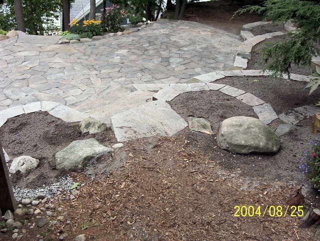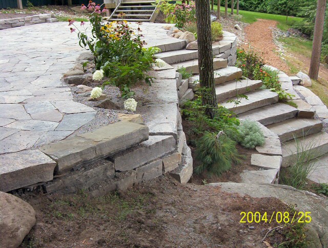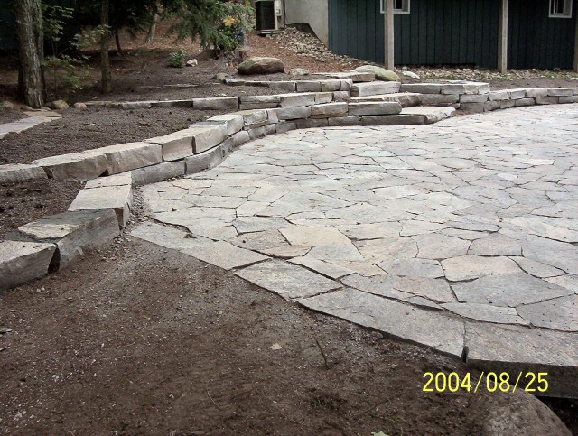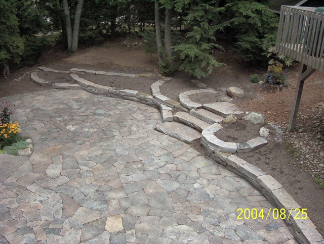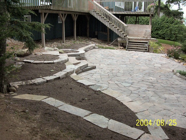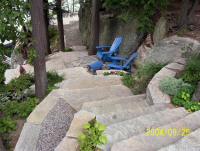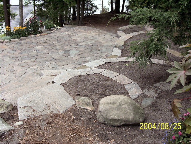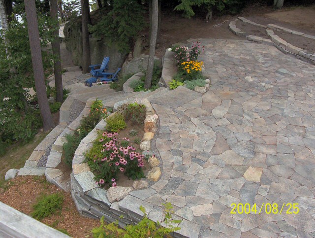 Natural stone landscaping in Parry Sound / Muskoka and the Georgian Bay Area. Quality flagstone hand carved and dry laid. Transform bush into trails down to waters edge with terraced patio's walkways and steps used to turn steep grade cottage lots into fine estates on Lake Muskoka, Joseph, Rosseau, and the Georgian Bay. All work guaranteed.