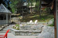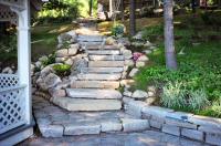 Natural stone landscaping in Parry Sound / Muskoka and the Georgian Bay Area. Quality flagstone hand carved and dry laid. Transform bush into trails down to waters edge with terraced patio's walkways and steps used to turn steep grade cottage lots into fine estates on Lake Muskoka, Joseph, Rosseau, and the Georgian Bay. All work guaranteed. Click photos to view photo set |