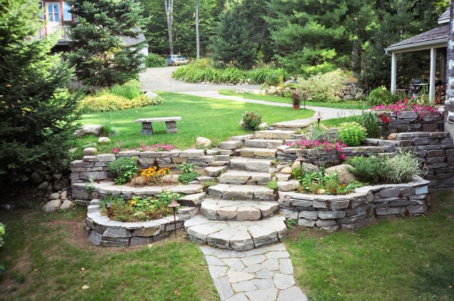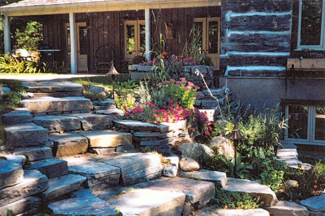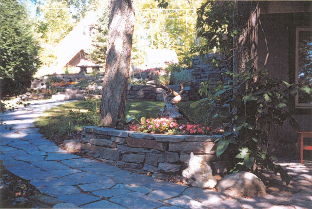 Natural stone landscaping in Parry Sound / Muskoka and the Georgian Bay Area. Quality flagstone hand carved and dry laid. Transform bush into trails down to waters edge with terraced patio's walkways and steps used to turn steep grade cottage lots into fine estates on Lake Muskoka, Joseph, Rosseau, and the Georgian Bay. All work guaranteed. Click photos to view enlarged image |