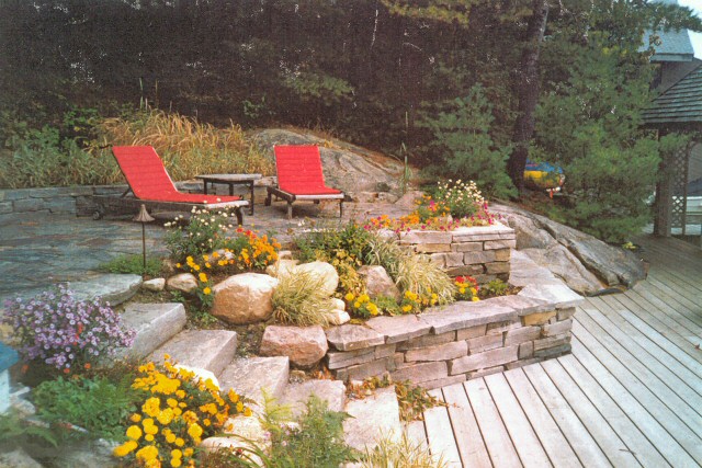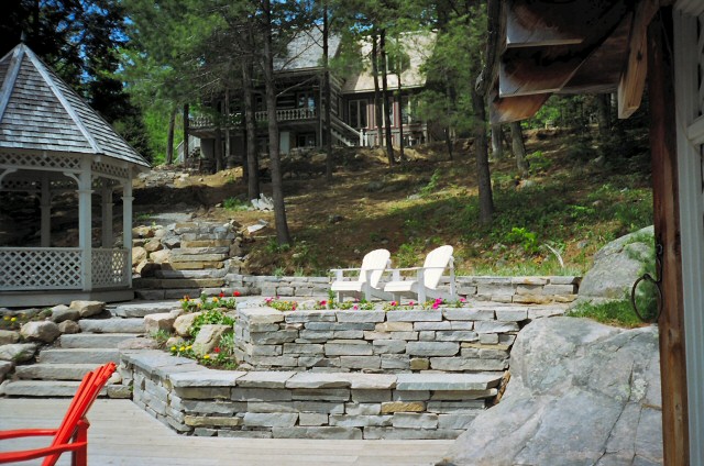 Natural stone landscaping in Parry Sound / Muskoka and the Georgian Bay Area. Quality flagstone hand carved and dry laid. Transform bush into trails down to waters edge with terraced patio's walkways and steps used to turn steep grade cottage lots into fine estates on Lake Muskoka, Joseph, Rosseau, and the Georgian Bay. All work guaranteed.