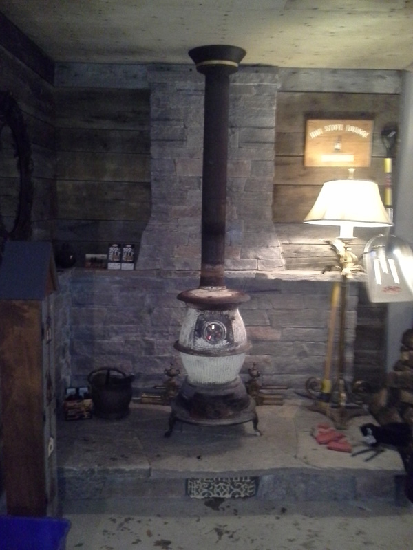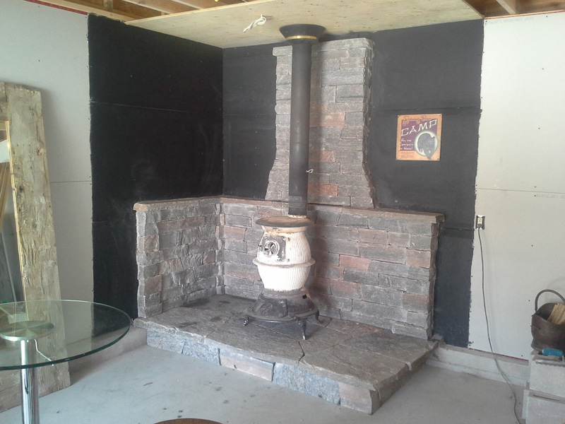 A free standing wood stove with a stone back wall. There is a fan system built into stone wall that circulates warm air out of base. Also a dry stack look with stones shaped to fit tightly.
